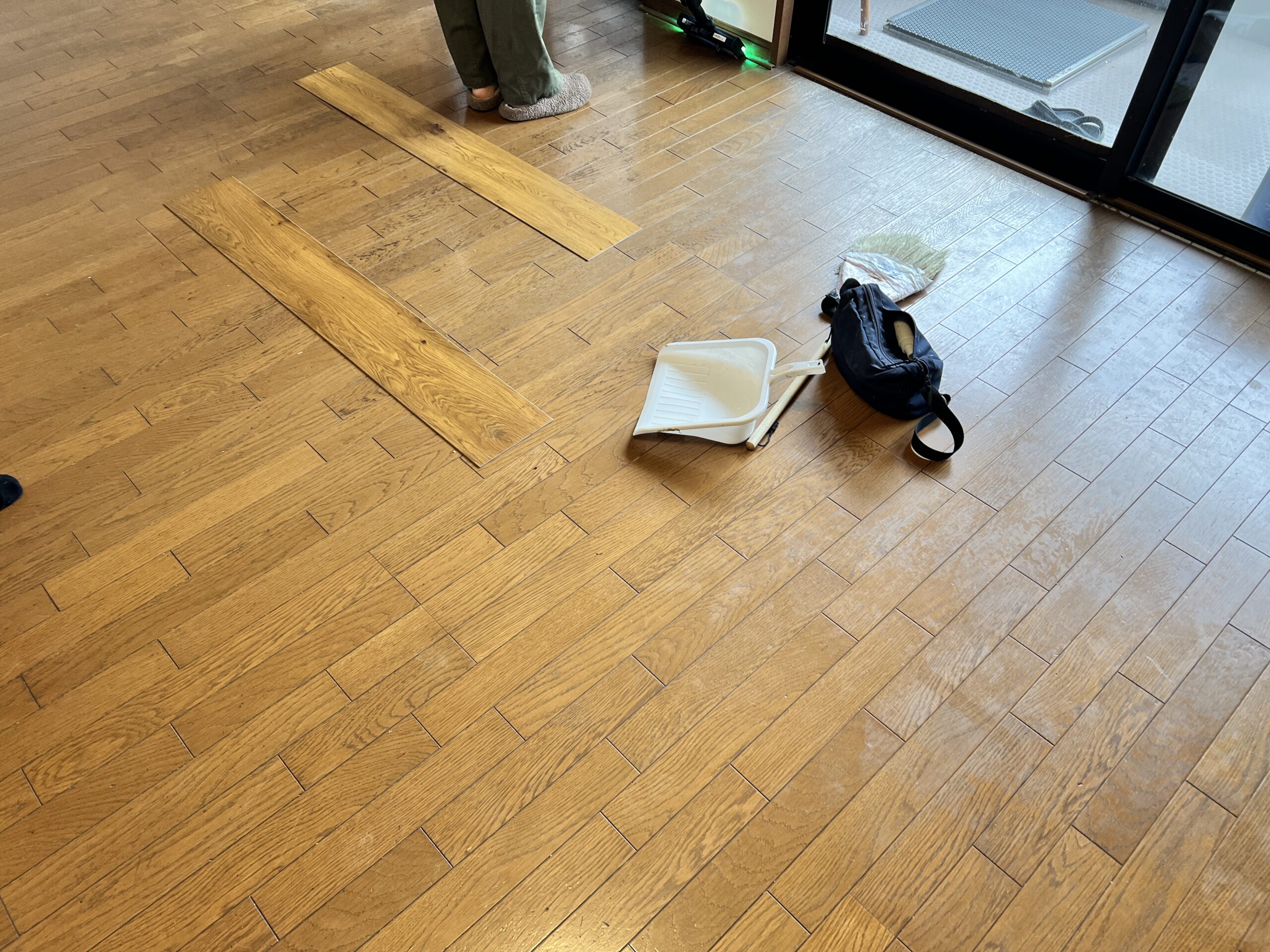 今回は既存のフローリングを撤去せず、フロアタイルを上から施工する方法を採用しました。