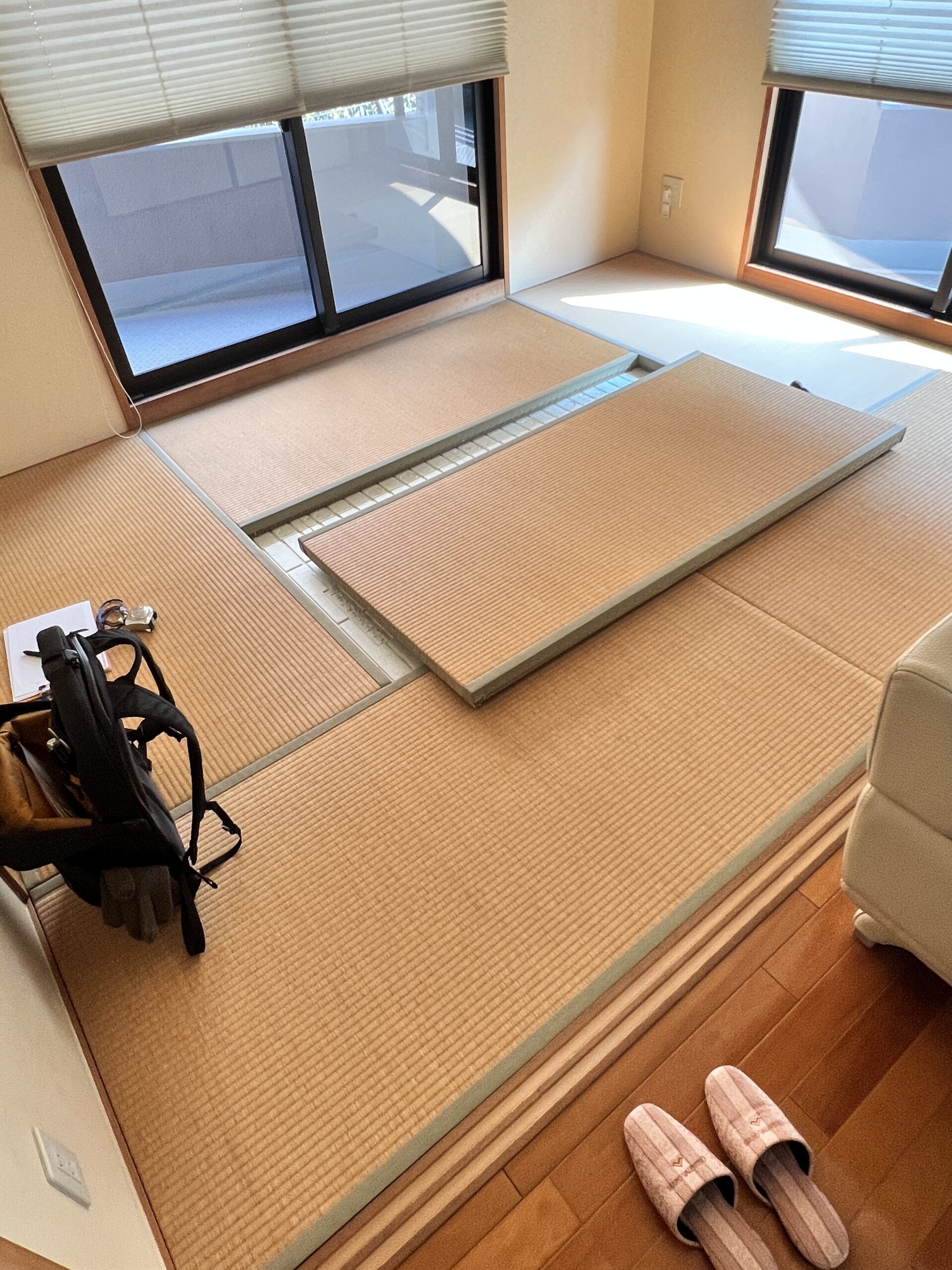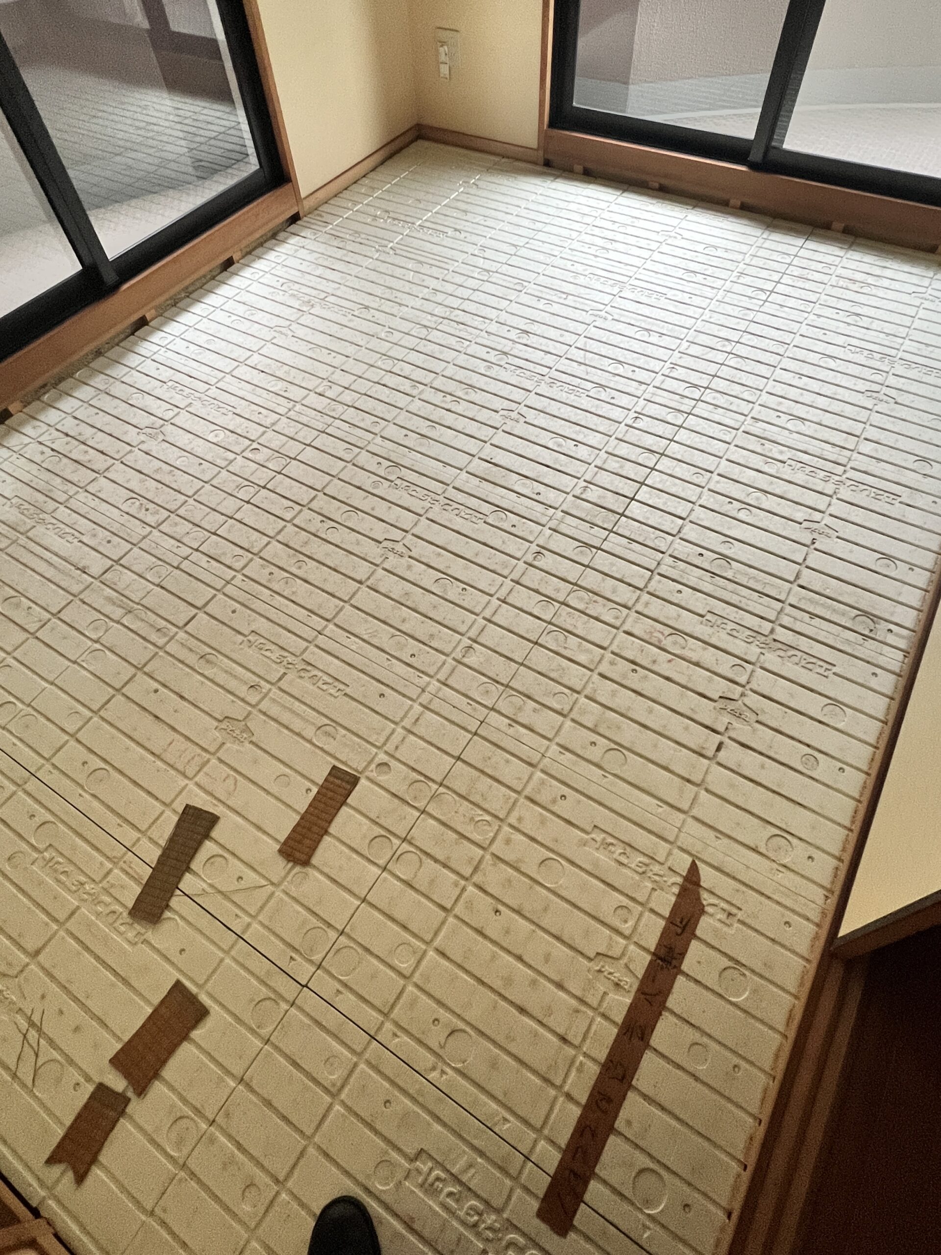 畳の下は一見きれいに見えても、不陸(凹凸)や既存接着剤の残りがあるケースが多く、そのまま施工すると床鳴りや仕上がり不良の原因になります。