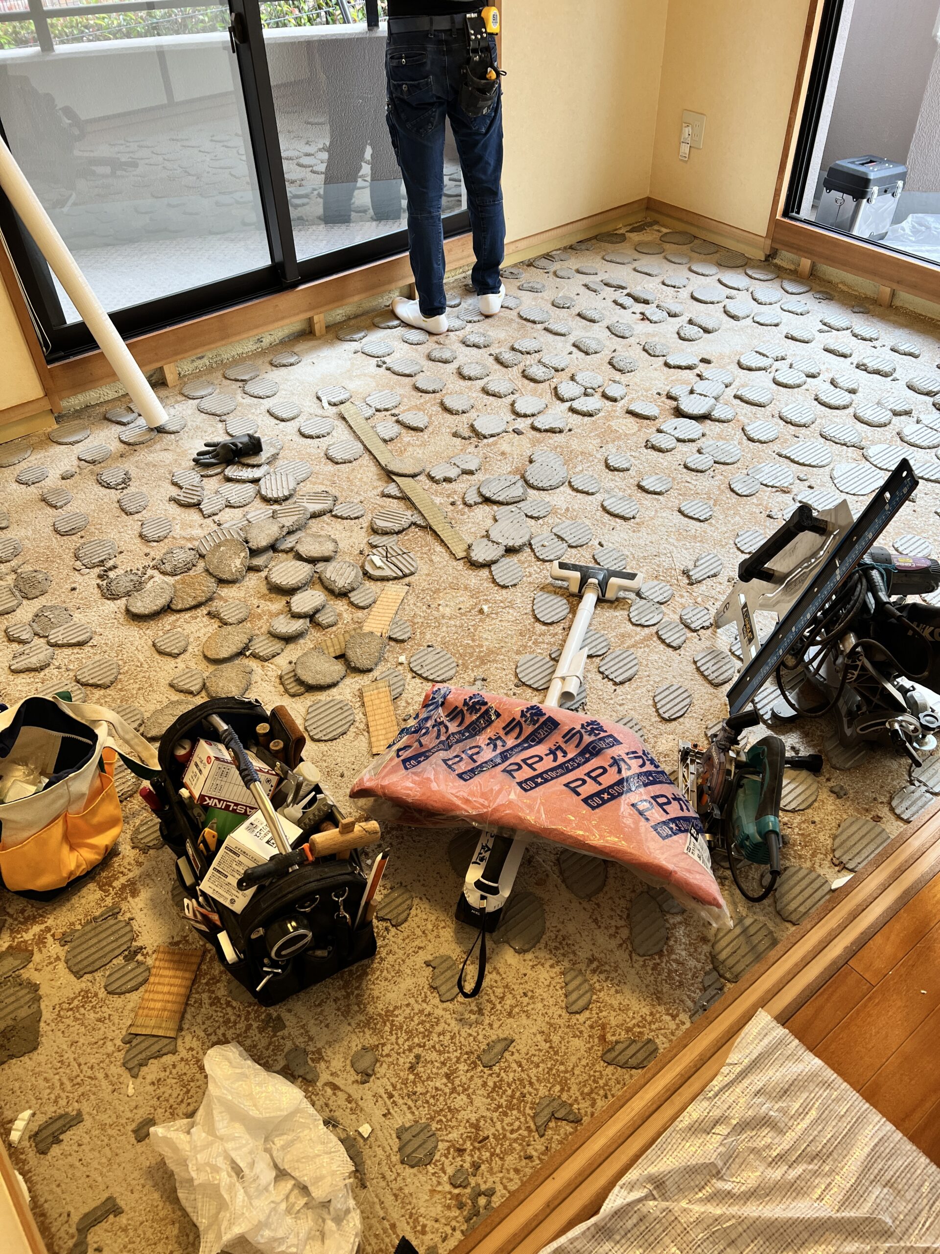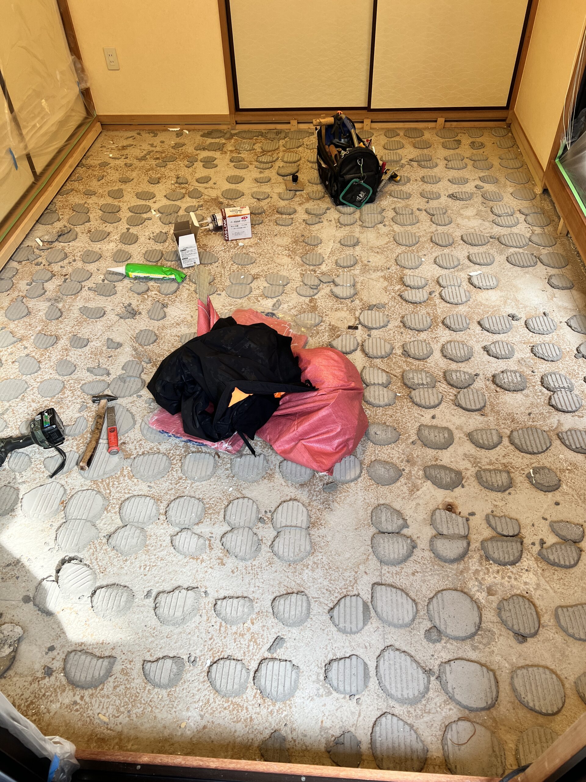 実際にめくってみると、ボンド跡や凹凸があり、そのままではフローリングを施工できない状態ですので、然るべき下地を作っていきます