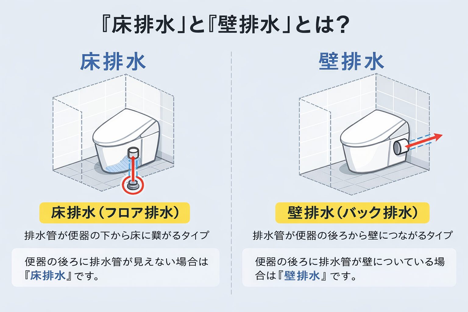 トイレの排水タイプが床からなのか壁からなのかを事前に確認する。